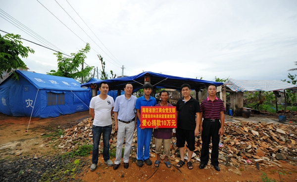 為臺風(fēng)受災(zāi)戶建一套房子,這是商會黨支部做出的一項決定。為此,黨支部連續(xù)2次在黨員中號召為災(zāi)區(qū)捐款,共捐款10萬元。黨支部派專人到臺風(fēng)最嚴重的翁田鎮(zhèn)聯(lián)系,到災(zāi)民家查看,山里村低保戶林召江家住了30多年的房子全部刮倒,夷為平地,這家非常困難,林召江在鎮(zhèn)上打零工,妻子是精神病患者,大兒子今年剛考上大學(xué),二兒子有病不能自理,如今全家住在救災(zāi)的帳篷里。27日下午,黨支部書記潘樟云、副書記印可平一行5人來到文昌市翁田鎮(zhèn)山里村,舉行了捐贈儀式,翁田鎮(zhèn)鎮(zhèn)長周安偉作為監(jiān)證方代表參加了捐贈活動,并且在捐贈協(xié)議書上簽了字。根據(jù)協(xié)議,這筆款必須用于建房,面積100平方米,根據(jù)工程進度分3次付清,首筆3萬元現(xiàn)金已經(jīng)送到林召江手中。