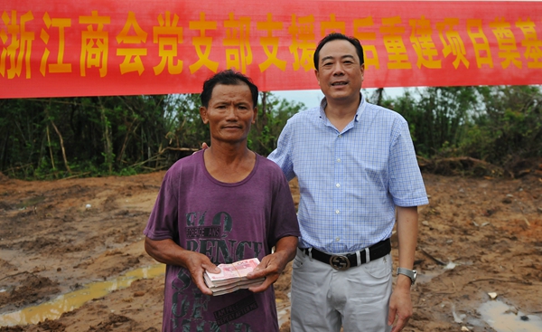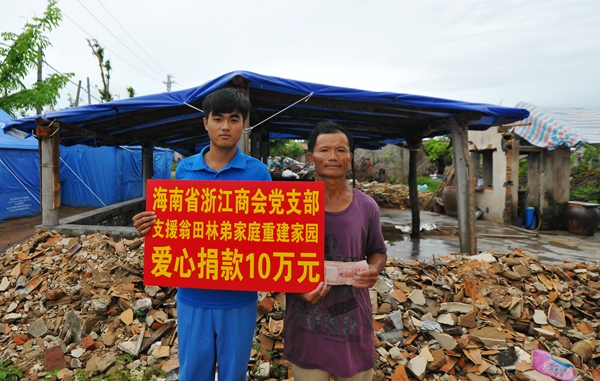 8月27日,這次臺風(fēng)的重災(zāi)區(qū)文昌市山里村出現(xiàn)了一個感人的場面,海南省浙江商會黨支部捐贈該村村民林召江家10萬元,用于這家的災(zāi)后重建。林召江從商會黨支部書記潘樟云手里接過現(xiàn)金,感動的說不出話來。