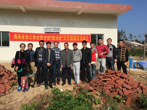 浙江商會黨支部從成立至今始終把公益事業(yè)放在首位,每年組織黨員、入黨積極分子進行捐款活動。今年“威馬遜”特大臺風給海南造成重創(chuàng),尤其是文昌受害最為嚴重。黨支部從臺風當天開始,積極組織發(fā)動大家捐款。這次為臺風共30人次捐款46900元。6月28日黨支部活動捐款47人次77200元。兩次共捐款124100元。經(jīng)過支部認真討論,決定對南國都市報報道的文昌翁田低保戶林召江家庭進行重點幫助。支部派人實地考察,決定為林召江家庭援建住房100平方,捐款10萬元用于災后房屋重建。經(jīng)過不到半年時間,該項目已于2014年12月30日前完工。2015年1月3日,黨支部組織黨員15人前去文昌翁田對援建項目進行驗收,并舉行了簡單的交接儀式。