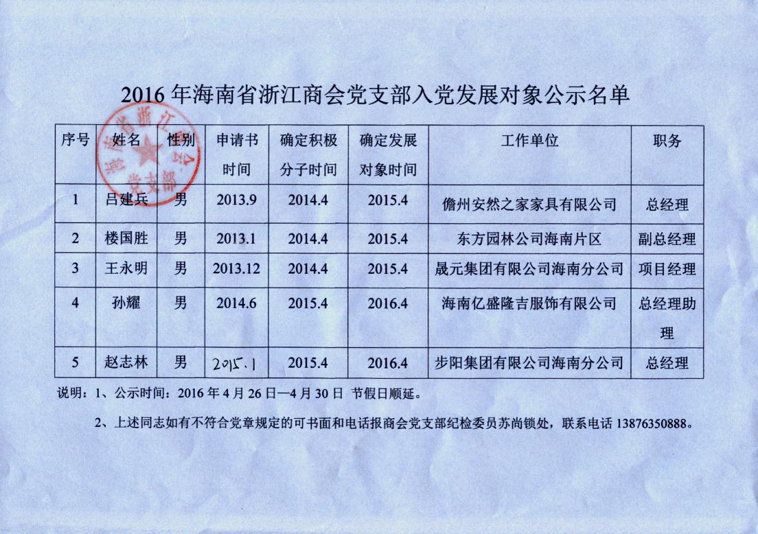 2016年海南省浙江商會黨支部入黨發(fā)展對象公示名單