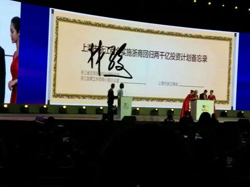 浙江省省委副書記、代省長車俊代表家鄉(xiāng)領(lǐng)導(dǎo)出席大會,浙江省發(fā)改委林駿副主任與上海市浙江商會簽訂了《關(guān)于上海市浙江商會實施浙商回歸兩千億投資計劃備忘錄》。