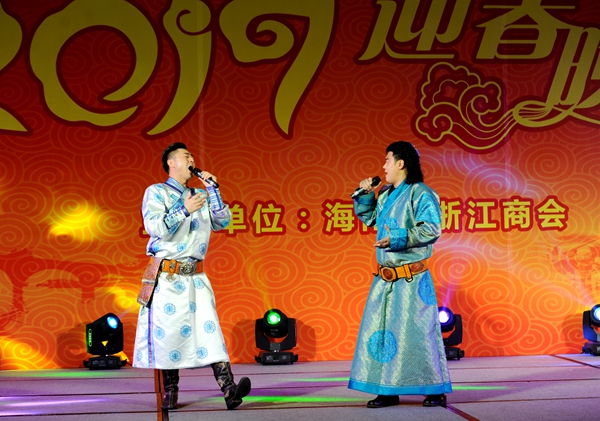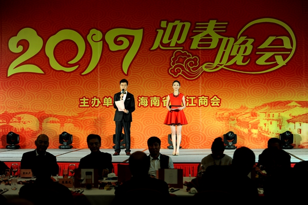 海南省浙江商會2017迎春晚會1月15日在?谂e行。商會會員和浙江老鄉(xiāng)500多人參加了晚會。商會蔡衛(wèi)華會長和老領(lǐng)導吳昌元上臺致辭,祝會員企業(yè)和老鄉(xiāng)們新的一年合家歡樂,取得更大的成績。來自內(nèi)蒙古的6名演員和海南的演奏家、歌唱家表演了豐富多彩的節(jié)目。