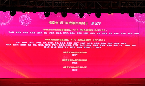 新當(dāng)選的海南省浙江商會(huì)第四屆常務(wù)副會(huì)長(zhǎng)共19名,(按姓氏筆劃排序,排名不分先后)王水耀、王回海、毛勝?gòu)?qiáng)、孔嘉銀、史莉萍(女)、朱岳海、劉建平、吳志明、吳國(guó)中、李黎明、張?jiān)鲈、季新天、金建、周勤富、宣勇、曹建紅、陶秀青、潘永強(qiáng)、潘樟云。