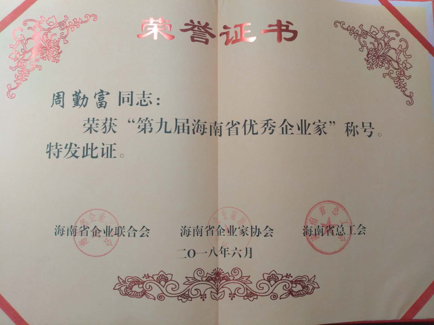 2015年11月,周勤富作為海南省唯一一個(gè)民營(yíng)企業(yè)家,以羅非魚(yú)養(yǎng)殖方面的專(zhuān)家身份受中共海南省委邀請(qǐng)參加海南省海洋經(jīng)濟(jì)“十三五”規(guī)劃發(fā)展專(zhuān)題研討會(huì),與省領(lǐng)導(dǎo)和著名海洋經(jīng)濟(jì)研究專(zhuān)家學(xué)者一起研究探討一個(gè)省的“十三五”經(jīng)濟(jì)發(fā)展規(guī)劃。這不是一般的榮譽(yù),這是最高的獎(jiǎng)勵(lì),是海南省委省政府對(duì)我本人35年在海南創(chuàng)業(yè)和對(duì)“三農(nóng)”貢獻(xiàn)的肯定和支持。