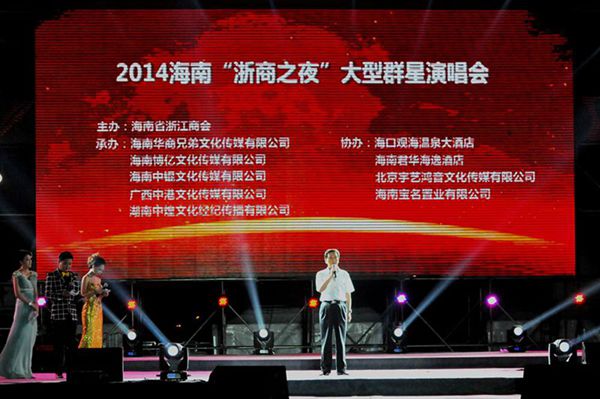 2014海南“浙商之夜”大型群星演唱會,于2014年4月26日晚20:00在海口國興大道海航文化廣場盛大舉行。演唱會由海南省浙江商會攜浙商企業主辦,海南華商兄弟文化傳媒有限公司、海南博億文化傳媒有限公司、海南中錕文化傳媒有限公司、廣西中港文化傳媒有限公司、海南中煌文化經濟傳播有限公司主辦。海口觀海溫泉大酒店、北京宇藝鴻文化傳媒有限公司、海南寶名置業有限公司協辦。
