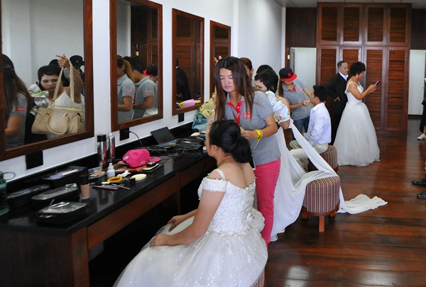 當天上午,參加拍攝婚紗照活動的10對父母陸續地到達該景區山頂公園婚禮教堂,在婚禮教堂工作間,化妝師門精心的為每對父母進行化妝打扮,經過一番化妝打扮后,許多年過半百的父母明顯的年輕了十歲,精神面貌煥然一新,人人臉上都帶著幸福的笑容。