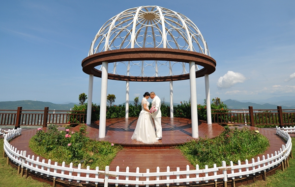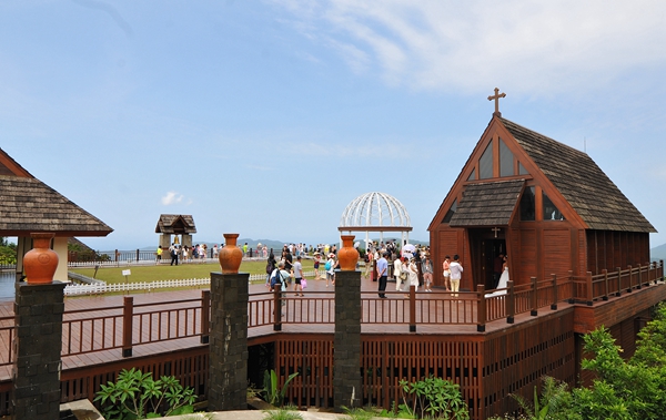 “笑一笑,親一下,看鏡頭,好嘞”。在山頂公園婚禮教堂廣場上看到,攝影師們不斷變換角度為這些老父母進行拍攝婚紗照,吸引在場的游客駐足觀看;槎Y教堂廣場風景美麗,是三亞拍攝婚紗照的一處勝地。俯拍亞龍灣海景,仰拍教堂建筑物,山頂公園每一個角度都是迷人的風景。