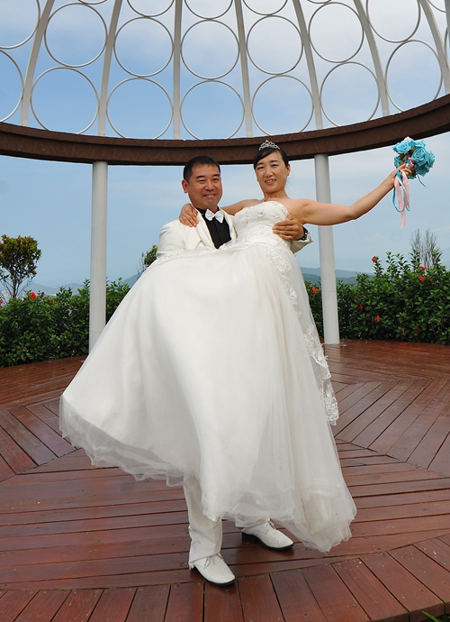 圖為母親節當天,來自全國各地的10對年過半百的父母,高興地參加了母親節為父母補拍婚紗照公益活動的情景。(黃慶優攝)